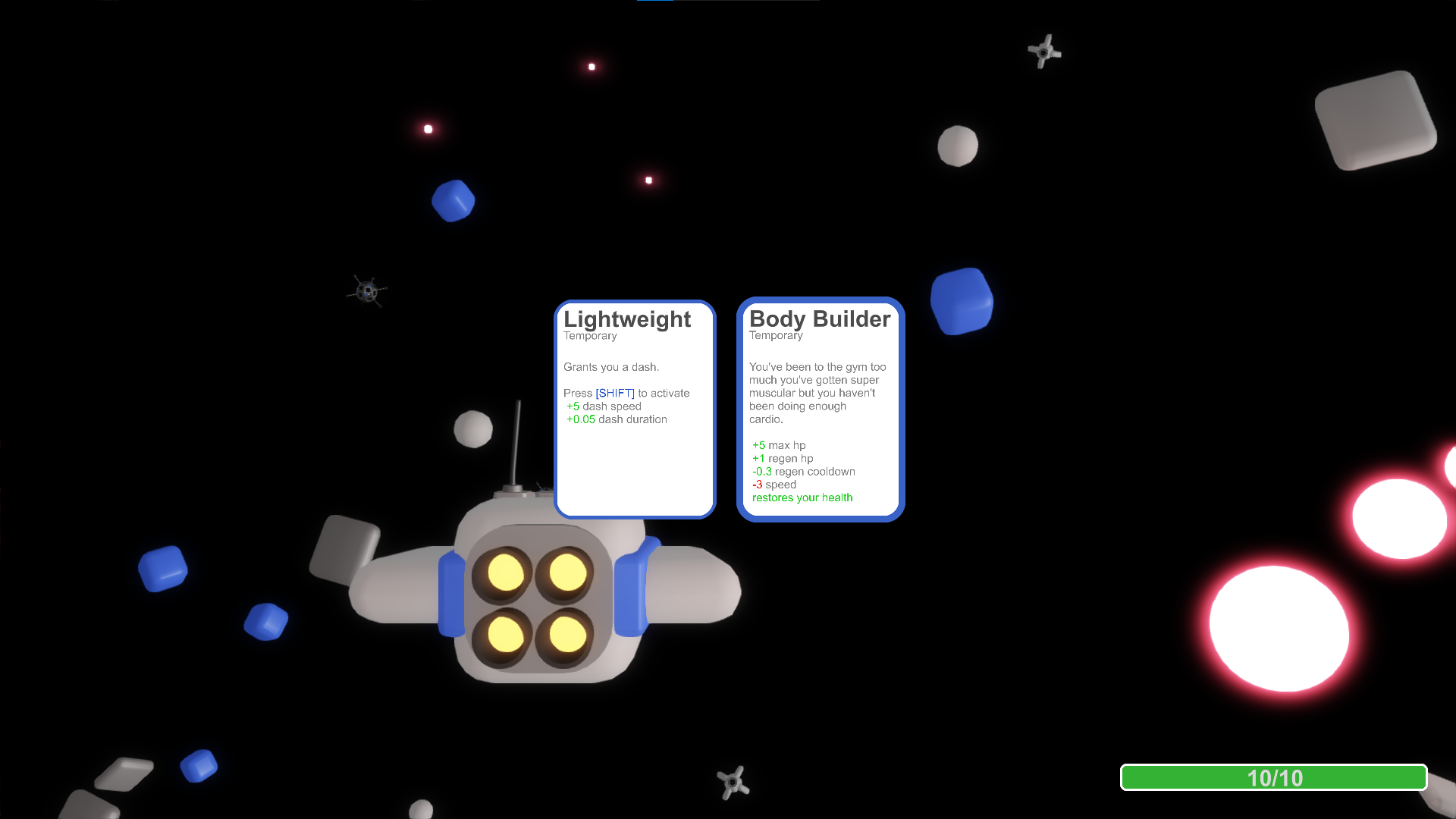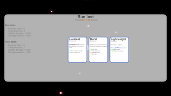 Play as a little spaceship, running for its life. Pickup cards to upgrade yourself and survive, but choose wisely. Cards have an impact on future loops.